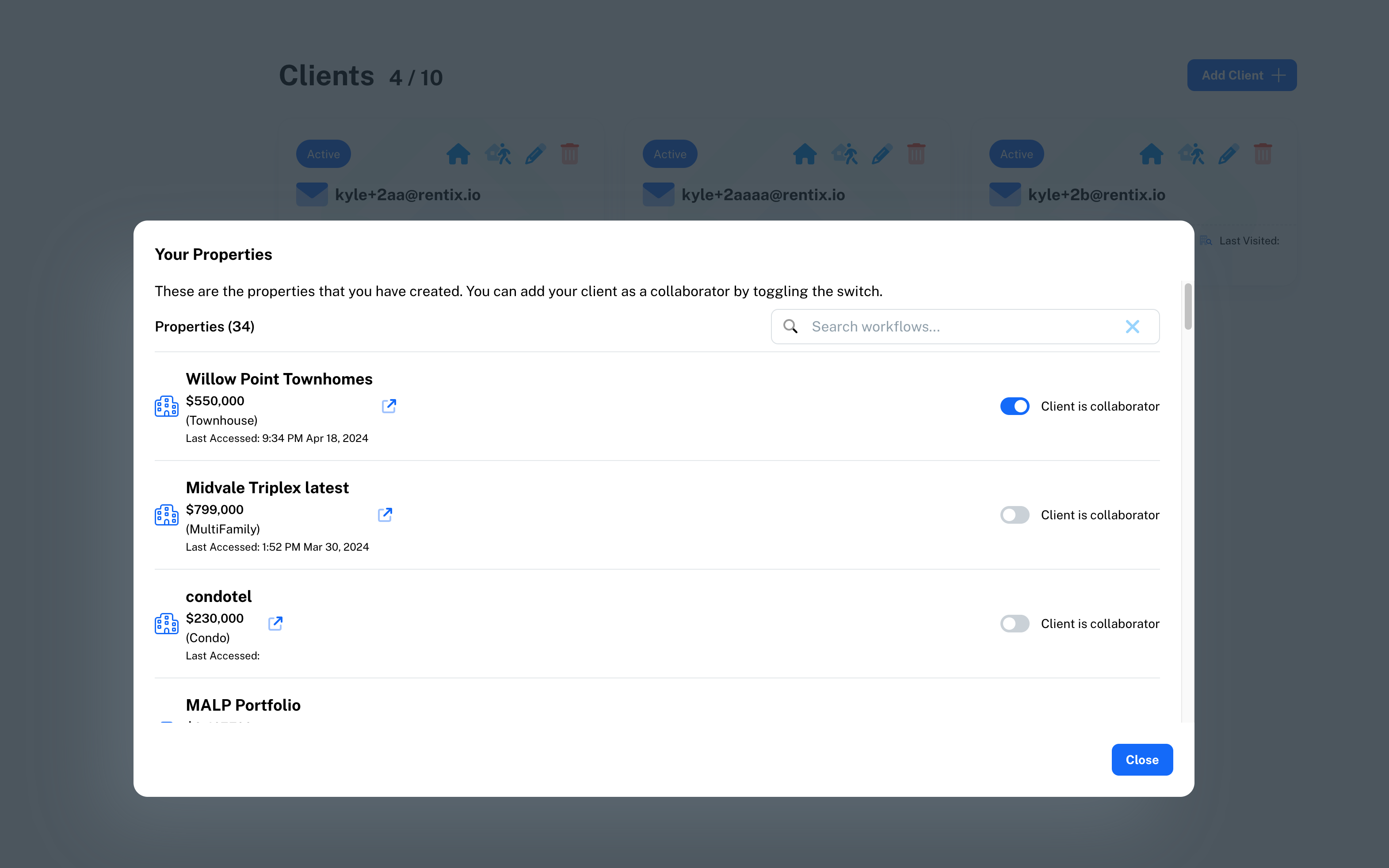 You can add or remove a client as a collaborator on a property by using the toggle on the right of the modal.